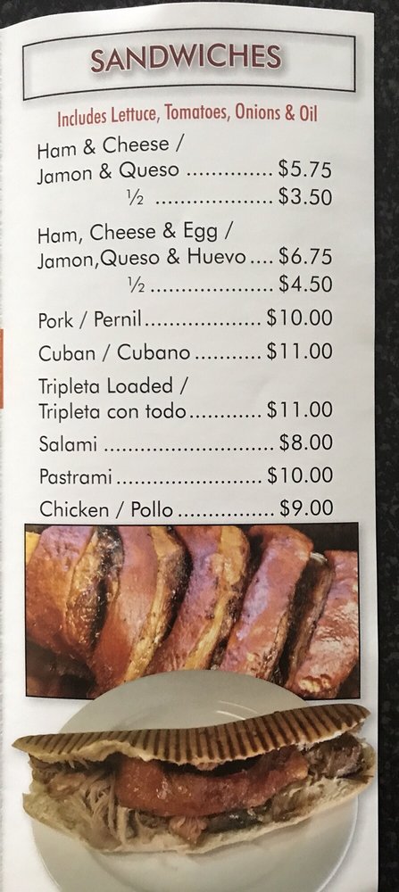 Cuban. Whole sandwich. Sandwich completo incluid lettuce, tomatoes, onion, cheese, mayonnaise, ketchup, pickels, mustard if you no want special instruction.